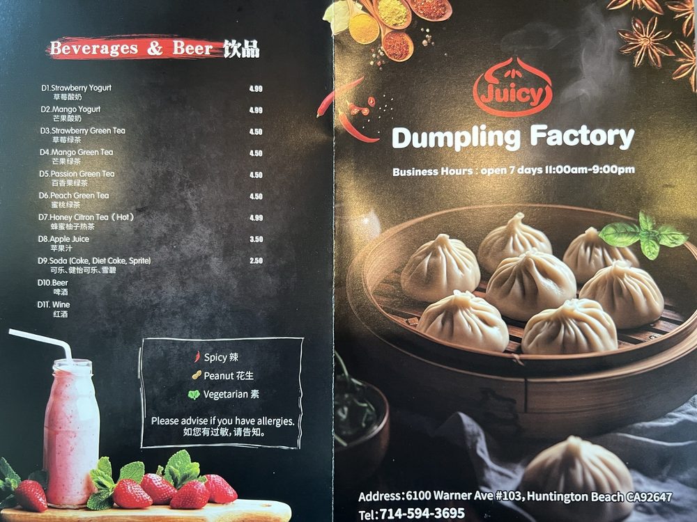 Juicy Dumpling Factory in Huntington Beach is a must-visit for dumpling enthusiasts seeking a no-fuss, flavorful experience. Located conveniently with ample parking, this Asian fusion restaurant offers a variety of dishes that tantalize the taste buds. Standout items include the crispy beef roll, juicy Xiao Long Bao, and well-balanced steamed dumplings. The braised beef noodle soup provides comfort and warmth, perfect for those looking for a milder option. The efficient service and casual atmosphere make dining here a pleasant experience. While the space can feel a bit cramped during busy hours, the overall quality of the food and quick turnover of tables make it worth the visit. Whether dining in or opting for takeout, Juicy Dumpling Factory delivers on its promise of delectable dumplings and satisfying meals.